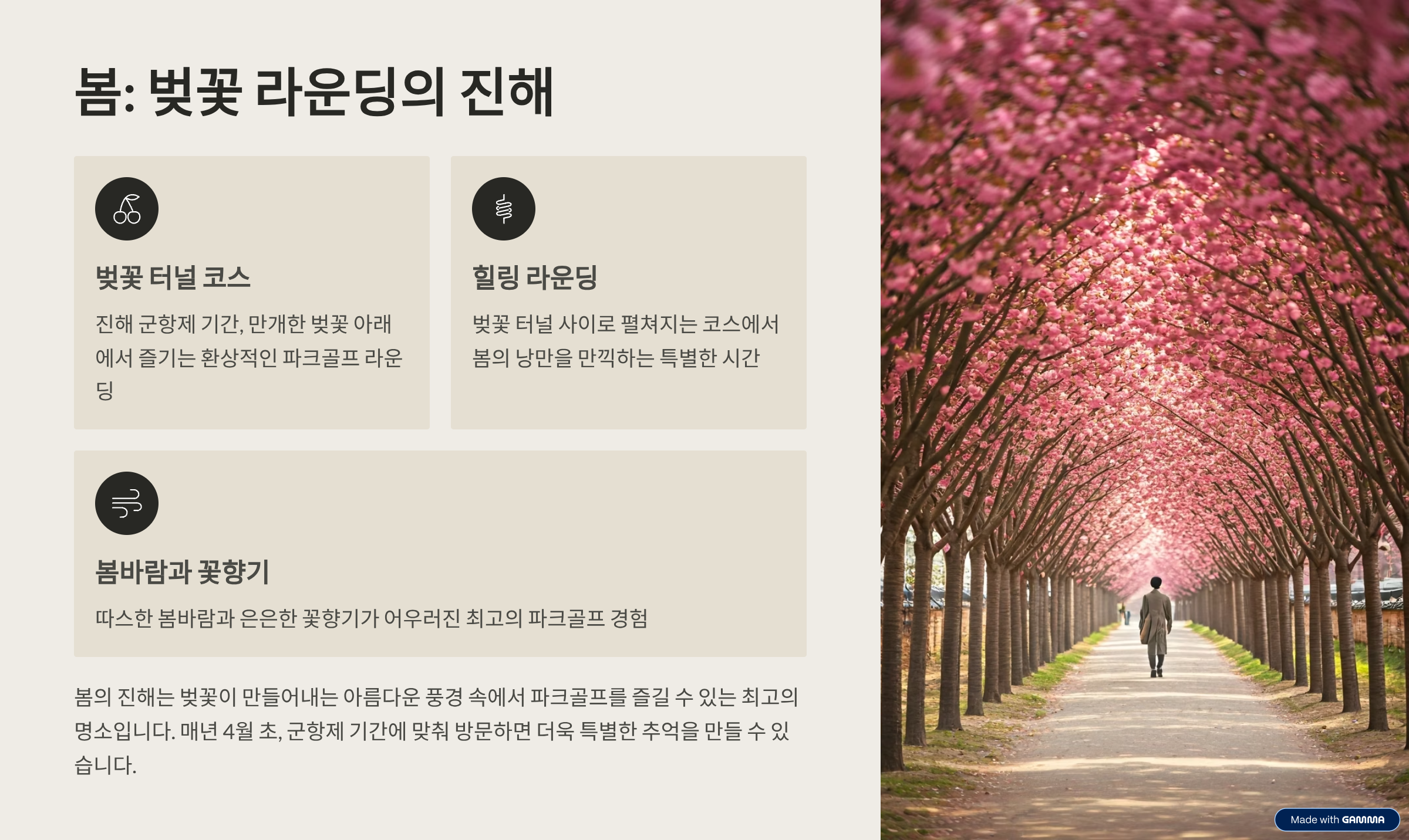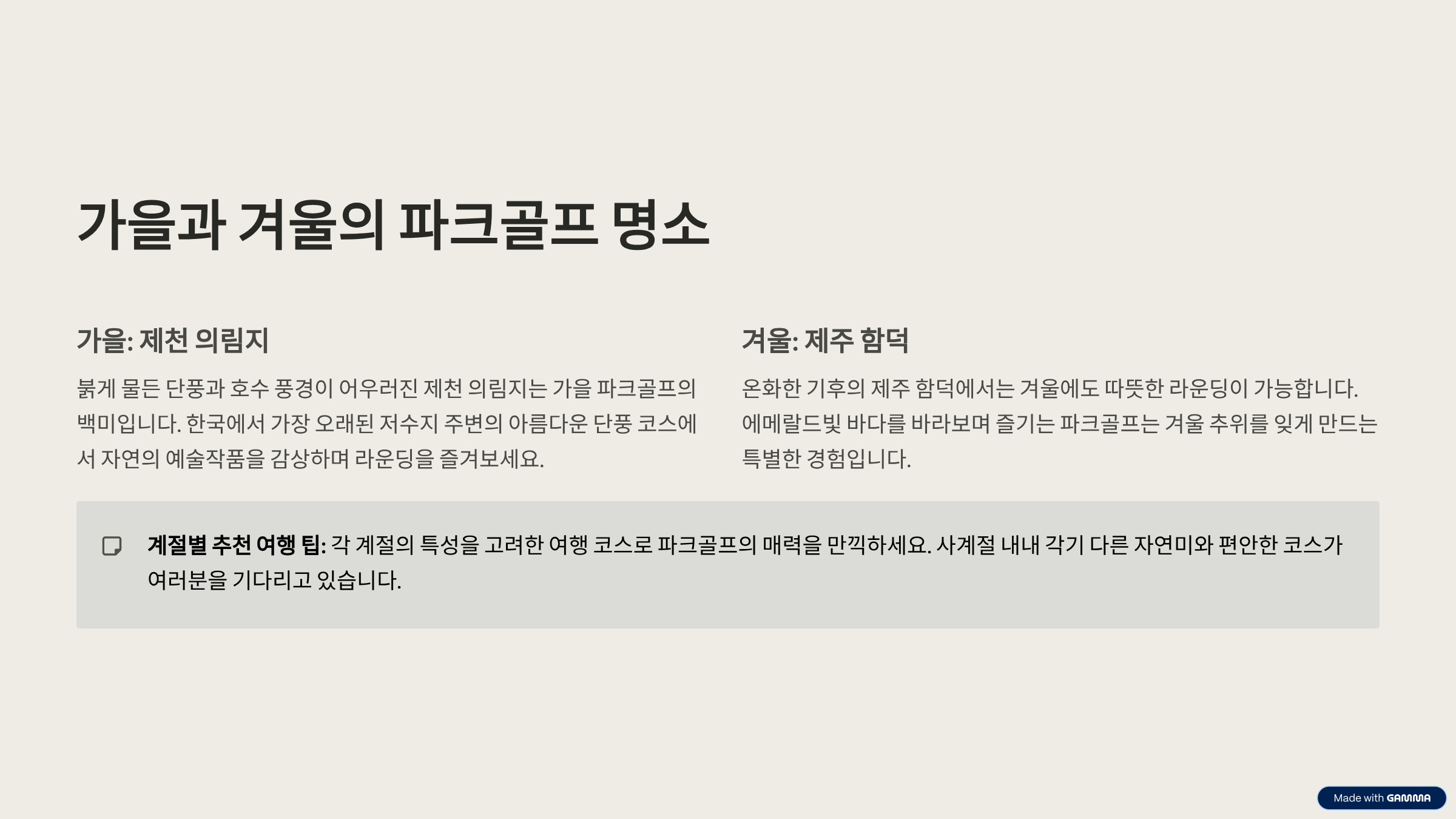 | 추천 대상 | 계절별 테마 여행을 즐기고 싶은 골퍼, 커플, 가족 단위 여행객 |
