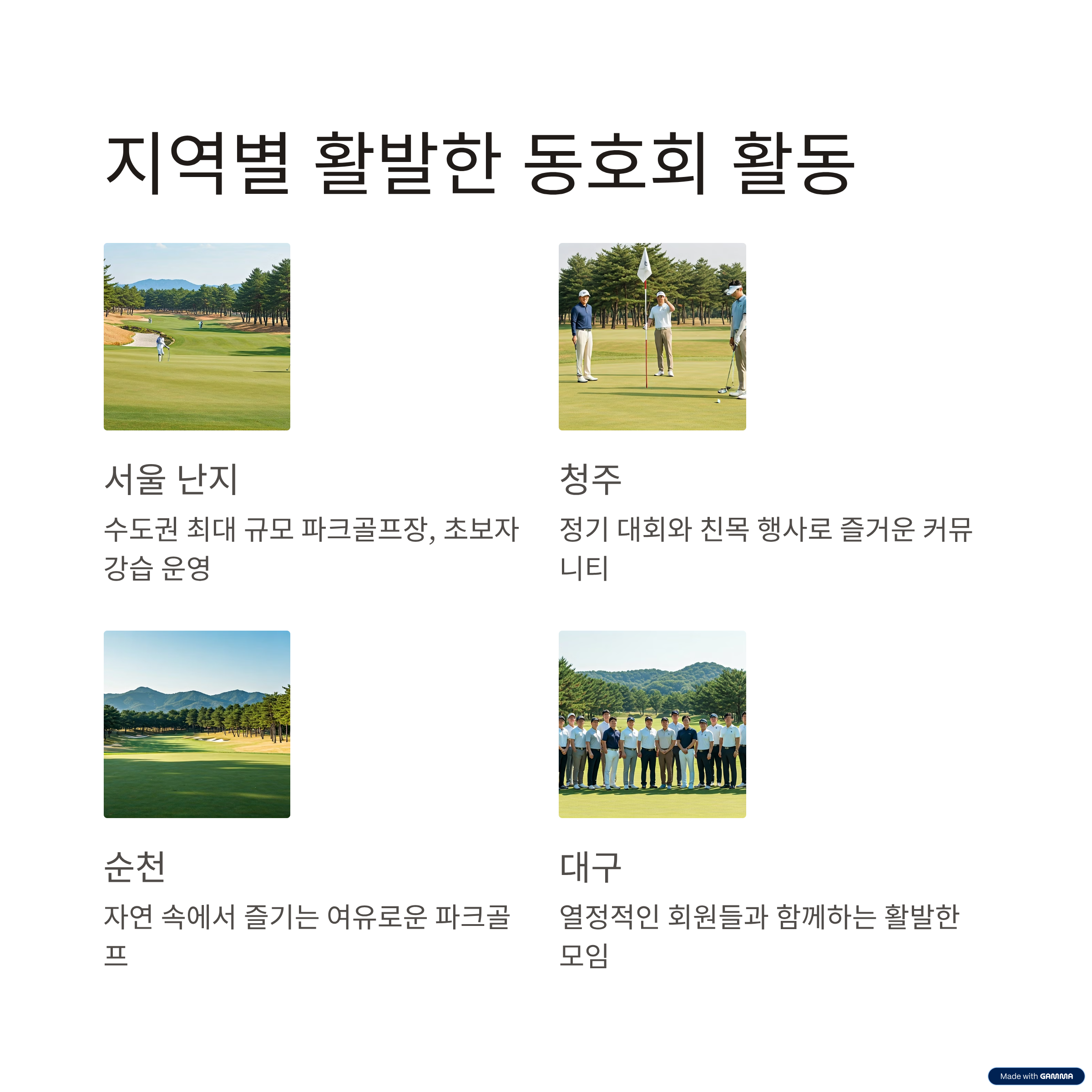 | 핵심 키워드 | 파크골프 동호회, 지역 커뮤니티, 시니어 스포츠 모임, 파크골프 소셜, 입문자 환영 |