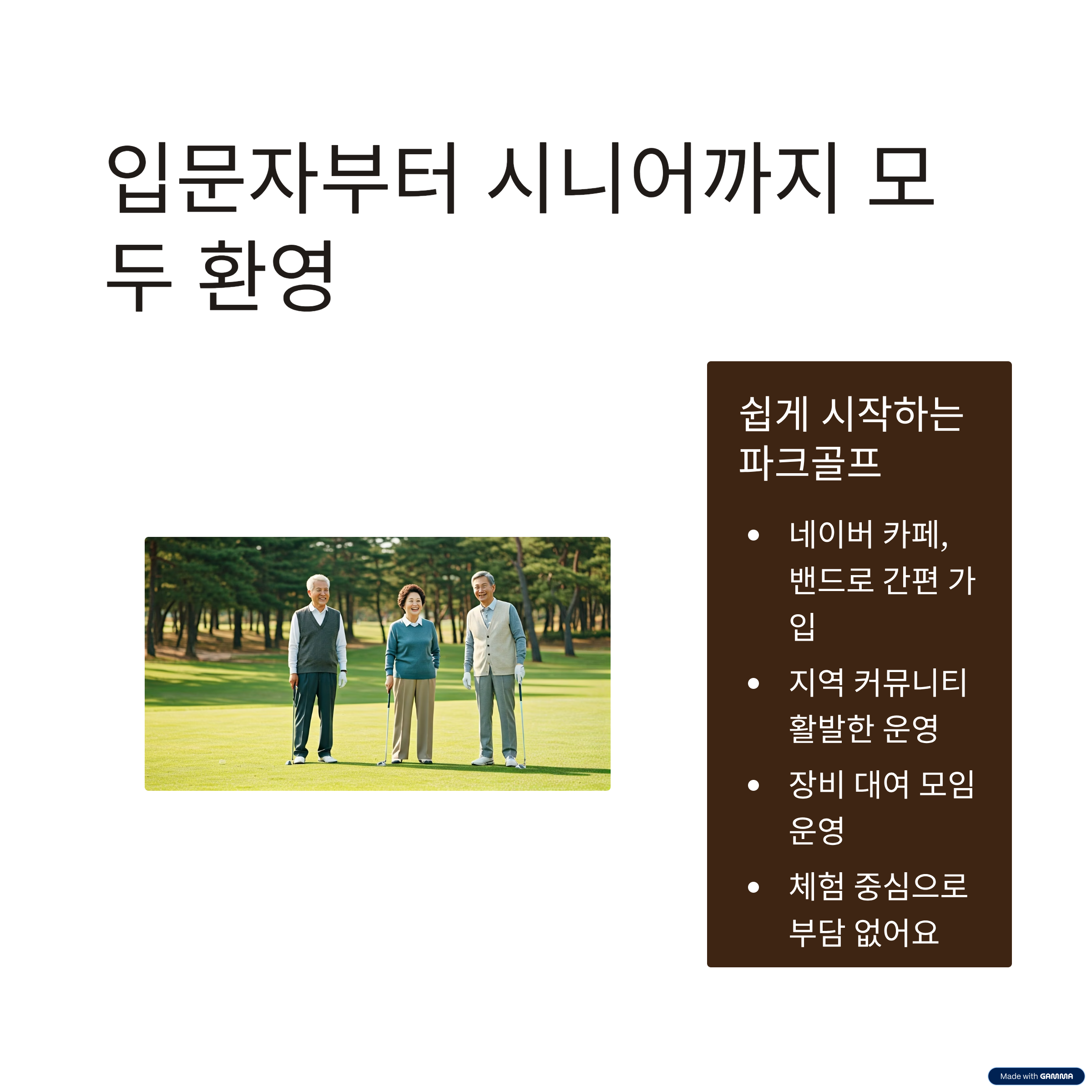 - 입문자 중심: 파크골프 처음부터, 시니어 라운딩 친구들, 매너파크골프밴드
