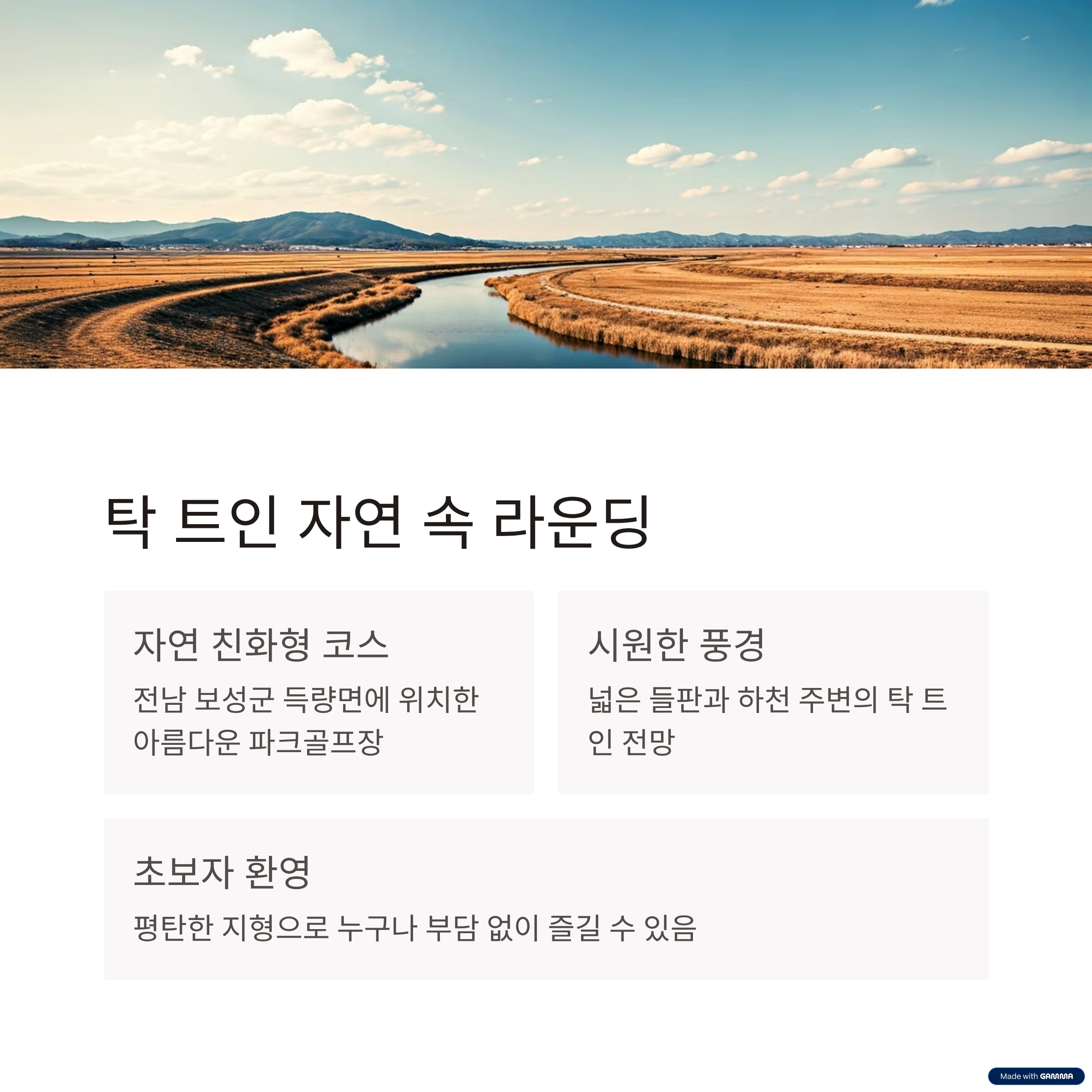 보성 득량 파크골프장은 전남 보성군 득량면 일대에 위치한 자연 친화형 파크골프장으로, 넓은 하천 주변과 푸른 들판 풍경을 배경으로 여유로운 라운딩을 즐길 수 있는 곳입니다. 도심의 소음에서 벗어나 한적한 분위기 속에서 운동과 힐링을 동시에 경험할 수 있어 지역 주민뿐 아니라 인근 지역 동호인들에게도 꾸준히 사랑받고 있습니다.