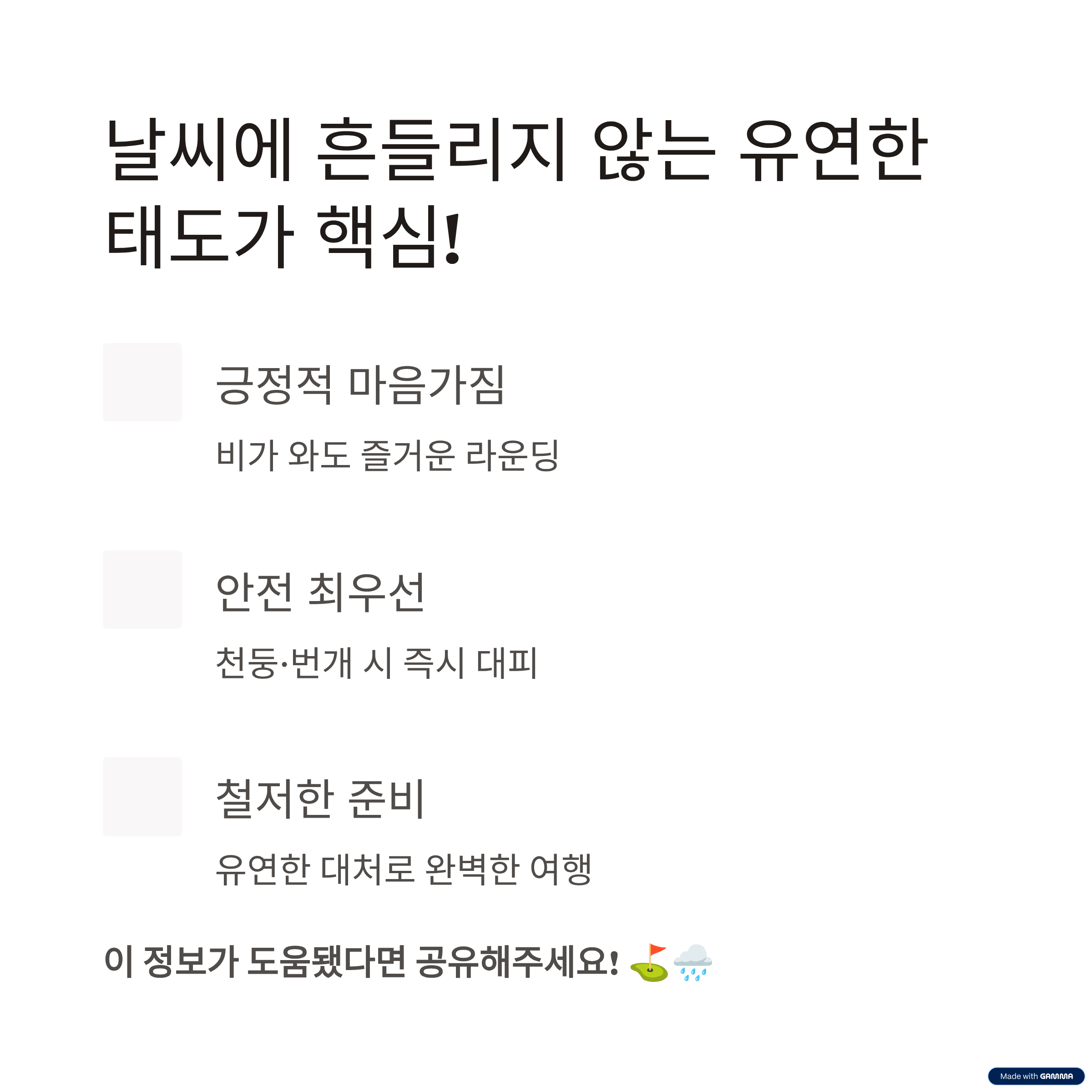 라운딩이 어렵다면 대체 일정도 유연하게 운영해 보세요. 인근 관광지, 실내 골프 연습장, 카페 투어 등을 조합하여 여행의 아쉬움을 줄일 수 있습니다. 일정 중 하루쯤은 자유롭게 흐름을 바꾸는 것도 여행의 묘미입니다. 중요한 건 날씨보다 함께하는 시간이라는 사실을 기억해주세요.