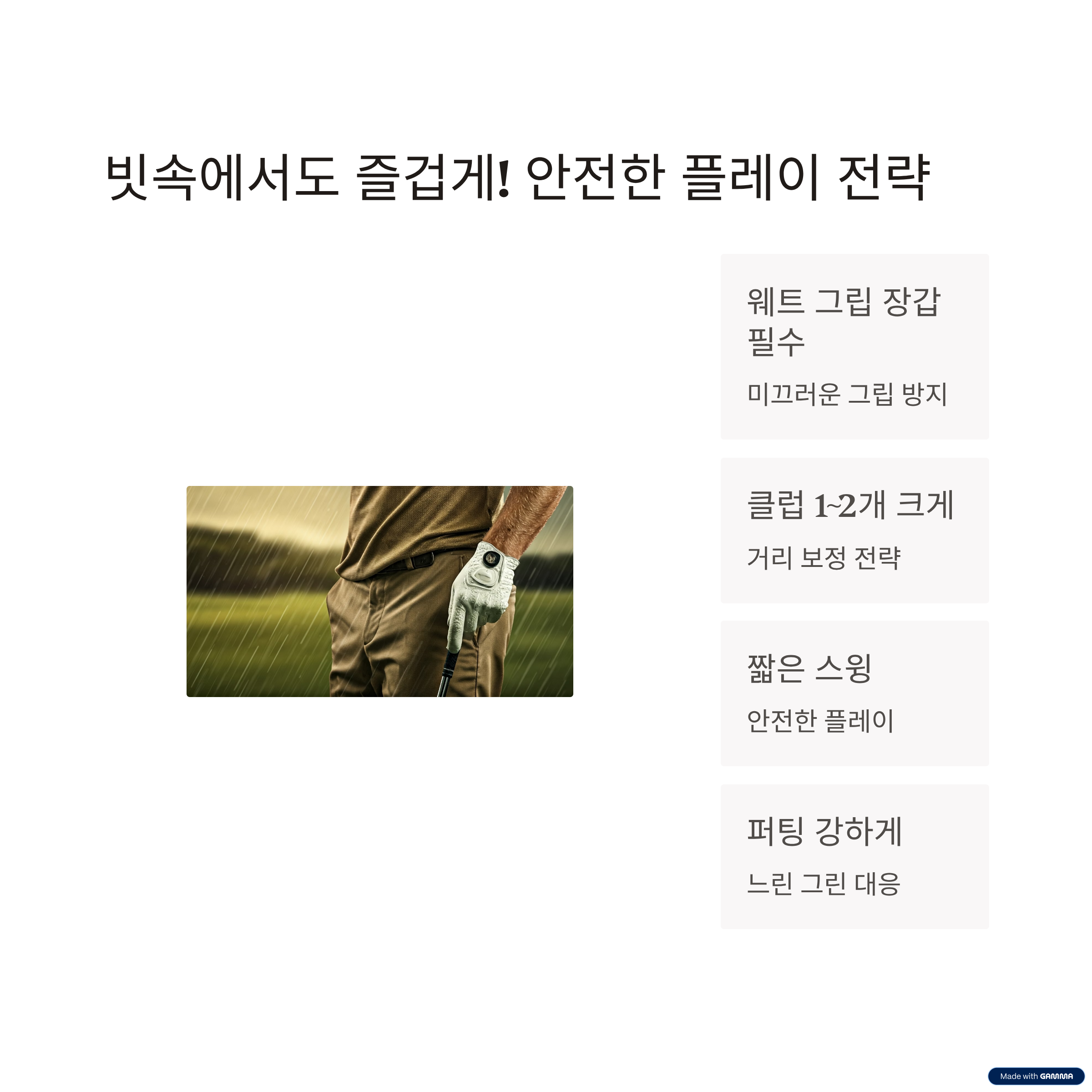 | 비오는 날 플레이 요령 | 미끄럼 주의하며 짧고 안정된 스윙으로 조절 |