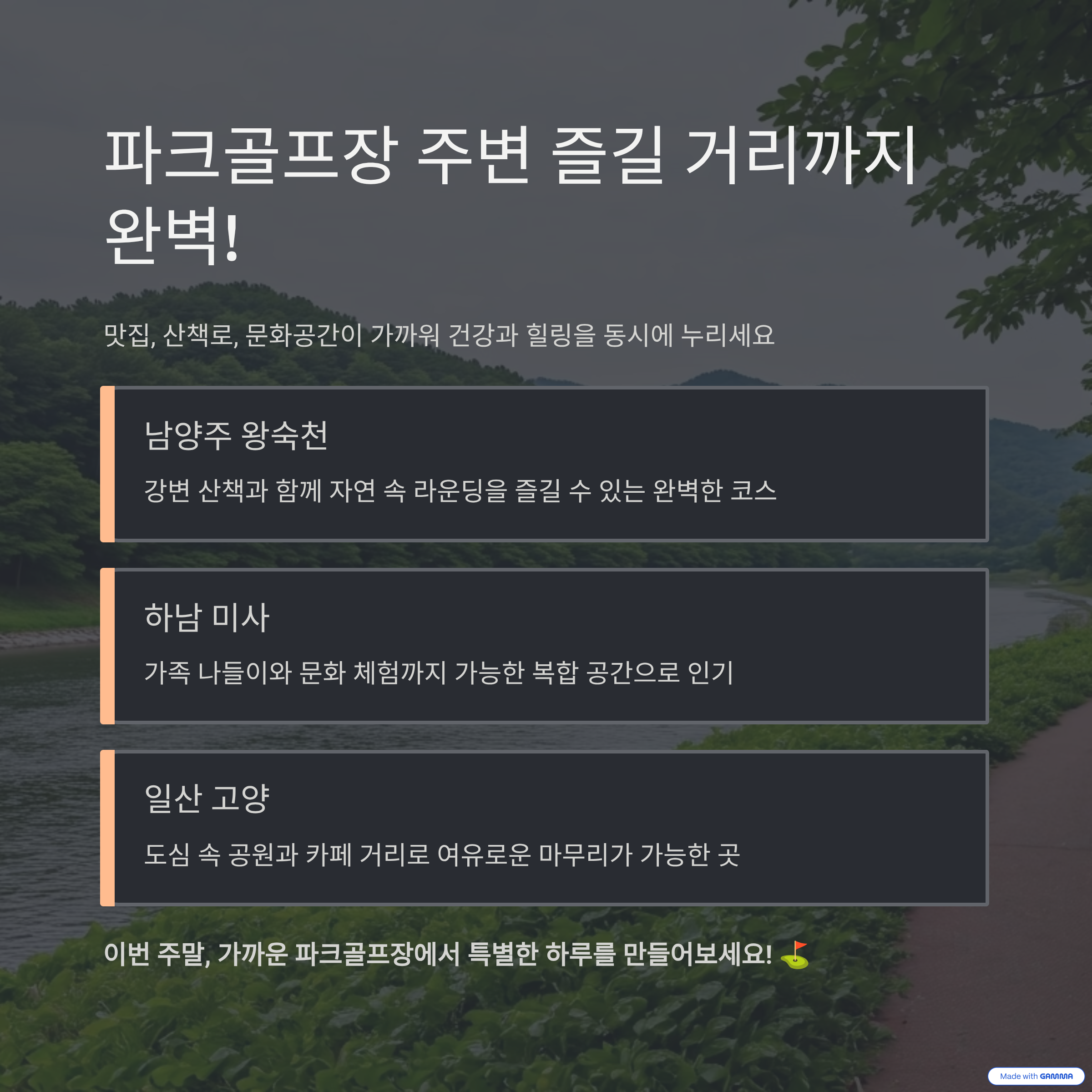| 핵심 키워드 | 서울근교여행, 파크골프, 당일치기, 경기권나들이, 건강레저 |