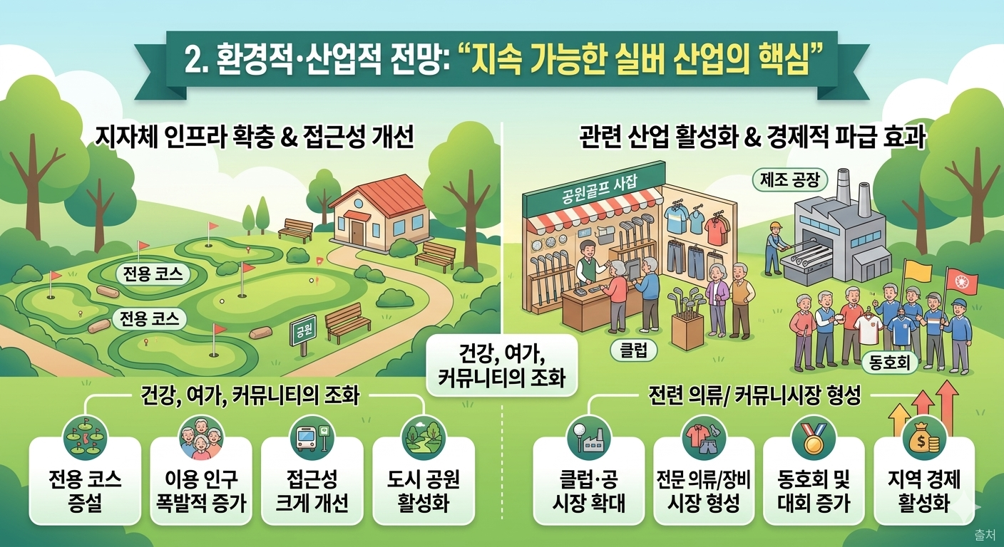 실버 스포츠 시장의 핵심은 지속 가능성입니다. 파크골프는 건강 관리와 여가, 커뮤니티 활동을 동시에 충족하며 고령화 사회에 적합한 구조를 갖추고 있습니다. 이러한 특성 덕분에 앞으로도 성장 가능성이 높은 종목으로 평가됩니다.