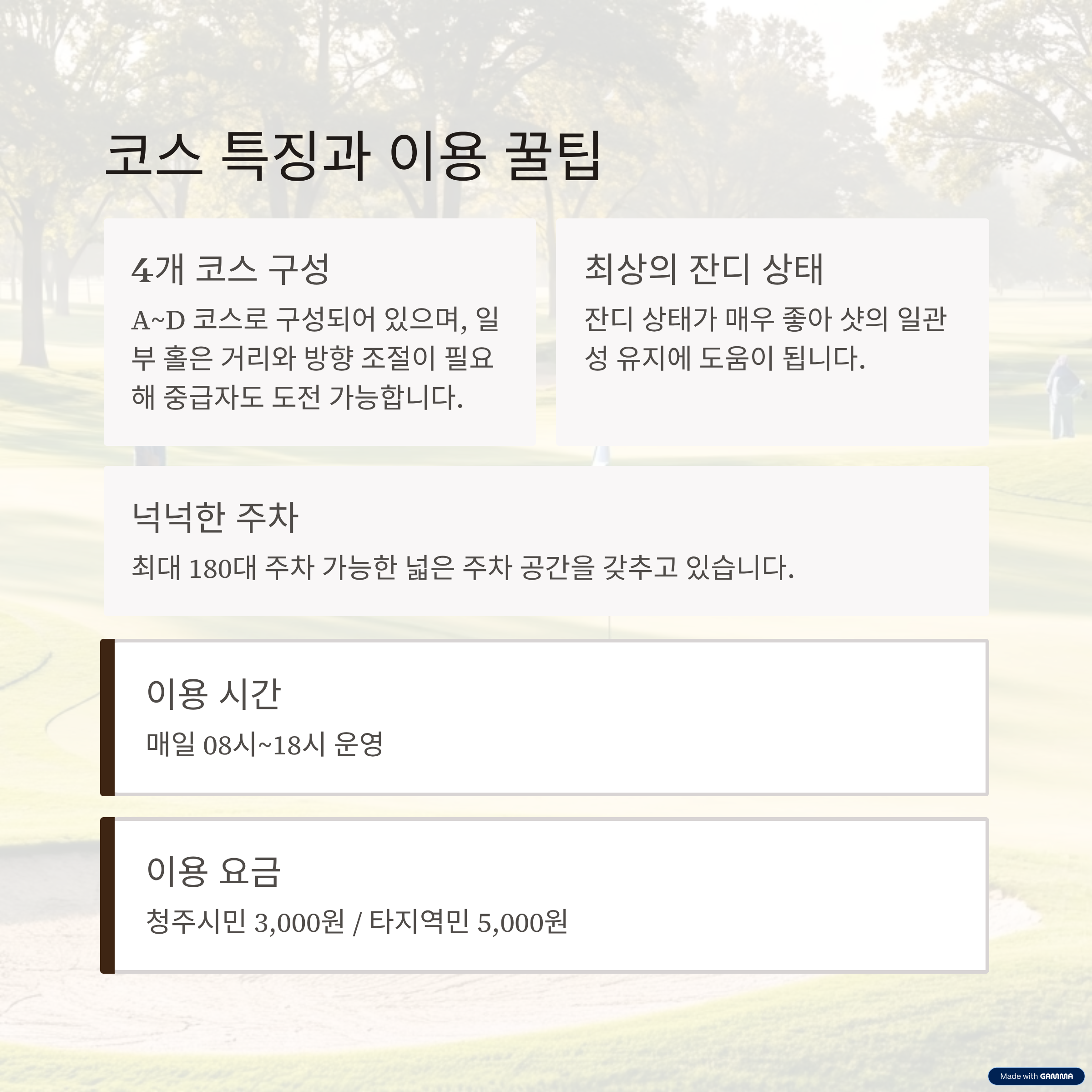 비교적 평탄한 지형으로 초보자도 쉽게 적응할 수 있으며, 일부 홀은 거리와 방향 조절이 중요한 전략적인 요소를 포함하고 있어 중급자 이상에게도 적절한 재미를 제공합니다. 도심과 가까우면서도 자연을 느낄 수 있는 환경이 장점입니다.