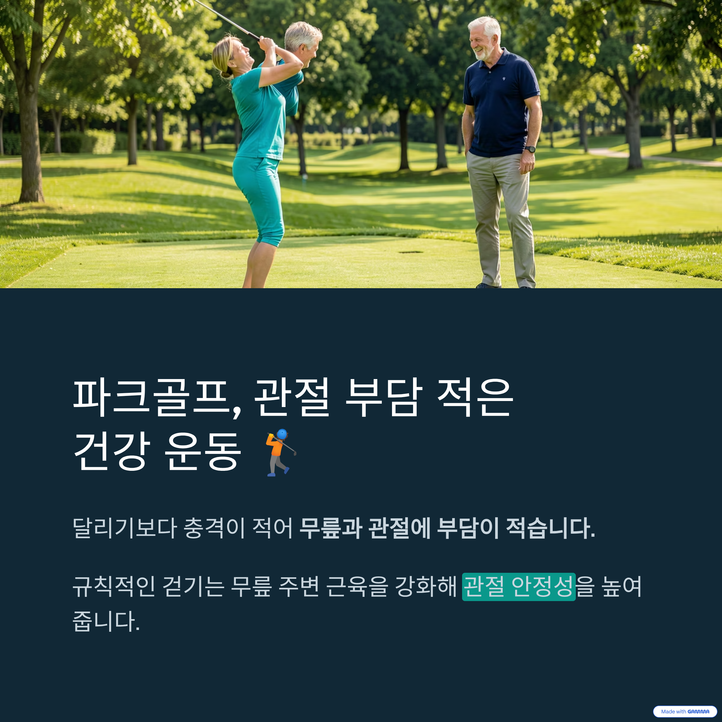 | 충격은 낮으나 장시간 보행 시 피로 누적 가능 | 과회전 시 통증 유발 가능 | 팔 힘 위주 스윙 시 부담 증가 |