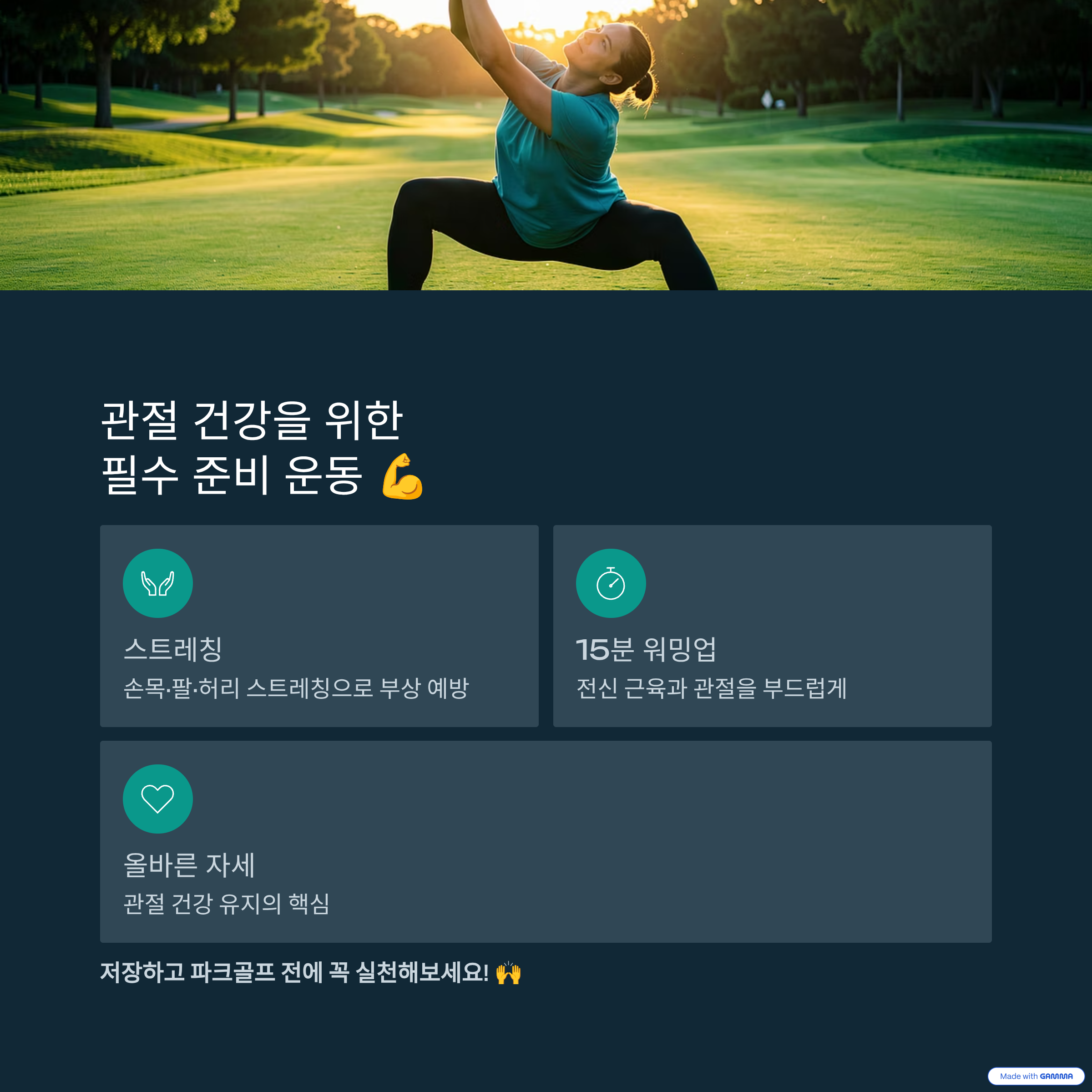 종합적으로 볼 때 파크골프는 관절에 과도한 충격을 주는 운동은 아니며, 적절한 강도와 올바른 자세를 유지한다면 관절 주변 근육 강화와 가동성 유지에 도움이 될 수 있습니다. 그러나 통증이 있는 상태에서 무리하게 지속하거나 준비 운동 없이 시작하면 부담이 커질 수 있습니다. 자신의 체력과 관절 상태를 고려해 강도를 조절하고 충분한 스트레칭을 병행하는 것이 관절 건강을 지키는 가장 중요한 원칙입니다.