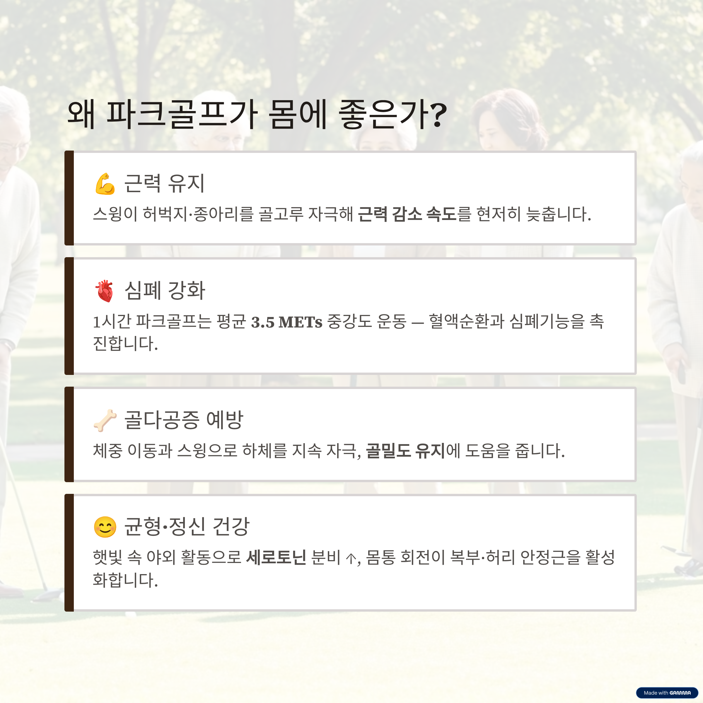 파크골프는 고강도 근력 운동은 아니지만 하체와 코어 근육을 꾸준히 사용하는 활동입니다. 규칙적으로 참여하면 근육 약화를 늦추고 균형 감각 유지에 도움을 줄 수 있습니다. 장기적인 근력 유지 관점에서 의미 있는 생활형 운동입니다.