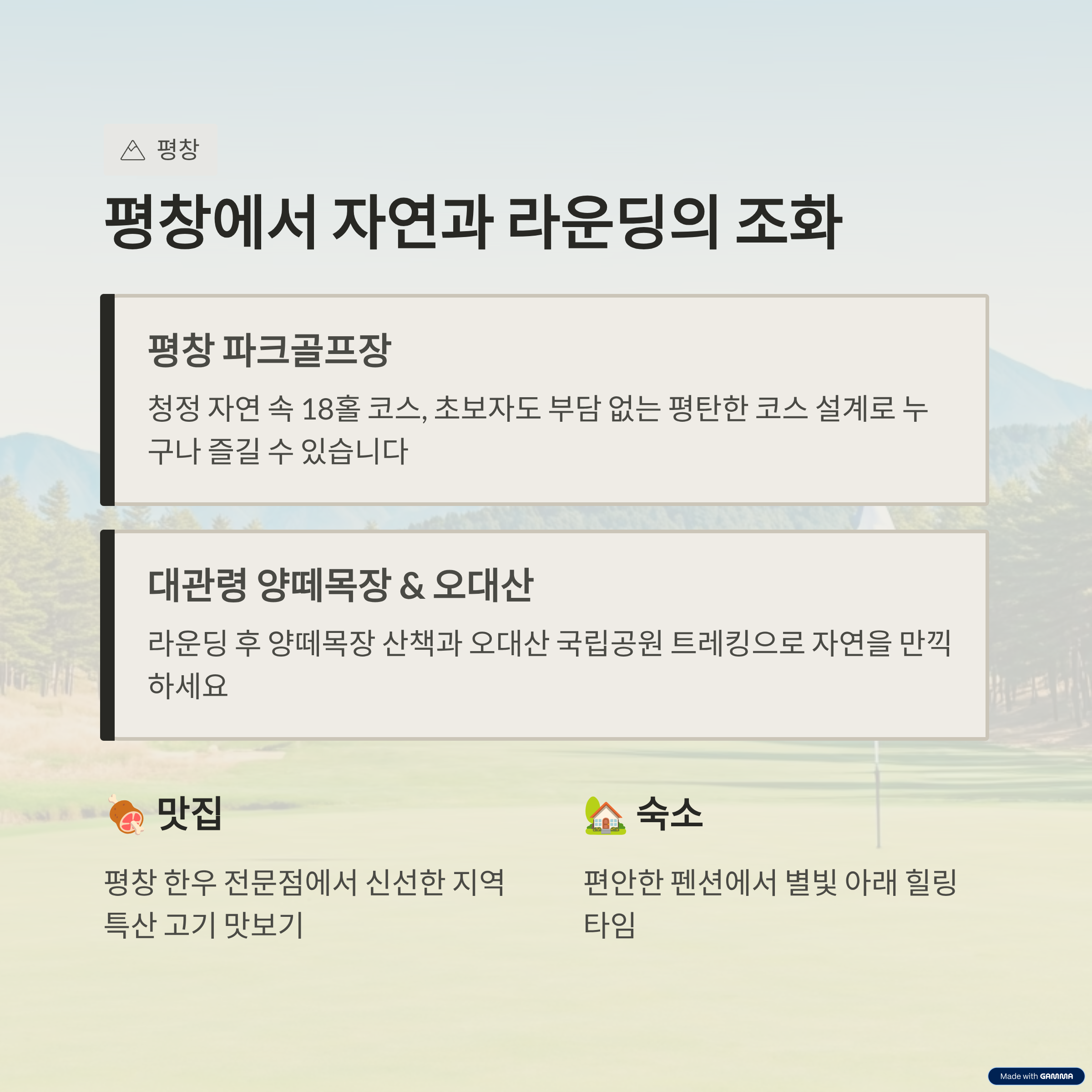 | 평창 봉평 | 파크골프 – 메밀국수 – 관광 | 전나무숲길 – 스파 |