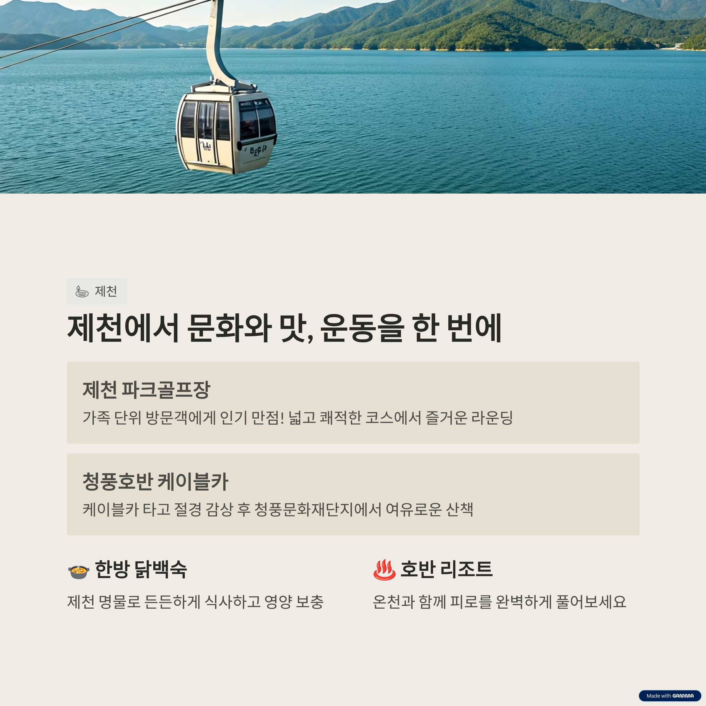 두 번째는 충북 제천 힐링 코스입니다. 1일 차 오전에는 의림지 파크골프장에서 경쾌하게 시작하고, 오후에는 약초시장과 제천 한방엑스포공원을 관람합니다. 숙소는 한방 테마 숙박이나 시골 감성의 한옥 스테이가 좋고, 저녁에는 의림지 야경 산책이 운치를 더합니다. 2일 차엔 청풍호 케이블카를 타고 풍경을 감상하거나 유람선을 타고 청풍문화재단지를 둘러보는 것도 추천됩니다.