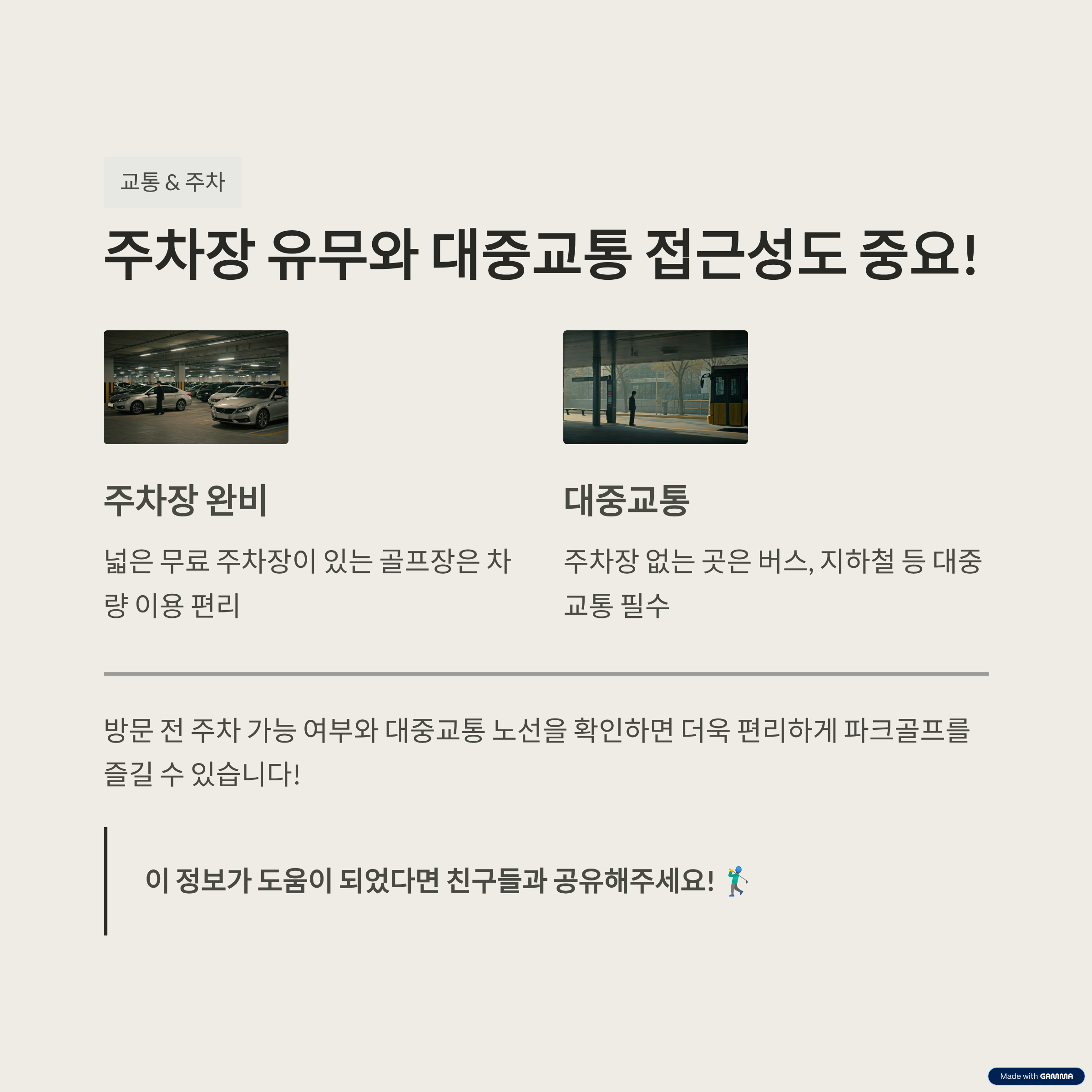 마지막으로 중요한 것은 주변 교통 및 주차입니다. 파크골프장은 도심 외곽이나 강변, 공원 내에 위치한 경우가 많아 대중교통 접근성이 떨어질 수 있습니다. 주차 공간 유무, 버스 정류장 거리 등 동반자(특히 어르신 포함 가족 단위)와 함께 이동 시에는 반드시 이동 경로를 미리 파악해두는 것이 중요합니다. 네이버 지도 리뷰나 블로그 후기를 활용하면 도움이 됩니다.