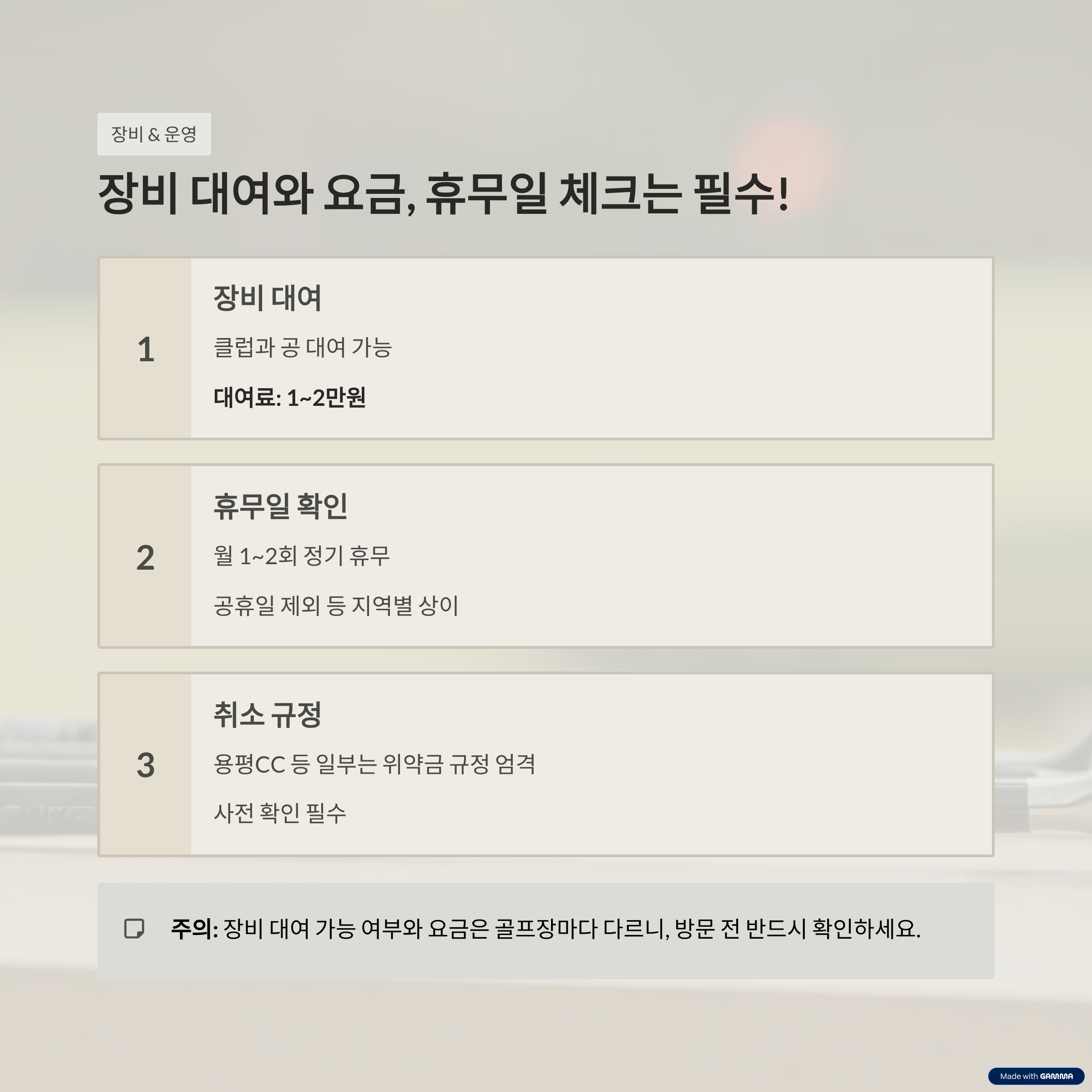두 번째로 중요한 체크포인트는 장비 대여 여부입니다. 일부 파크골프장은 클럽과 공을 현장에서 대여해주지만, 대여가 불가능한 곳도 있으므로 사전 문의가 필요합니다. 또한, 요금 정책도 다양해 무료 운영인지 또는 유료(1,000~5,000원 수준)인지 미리 알아두면 좋습니다. 단체 예약 시 할인 또는 별도 절차가 있는 경우도 있으니 참고하세요.