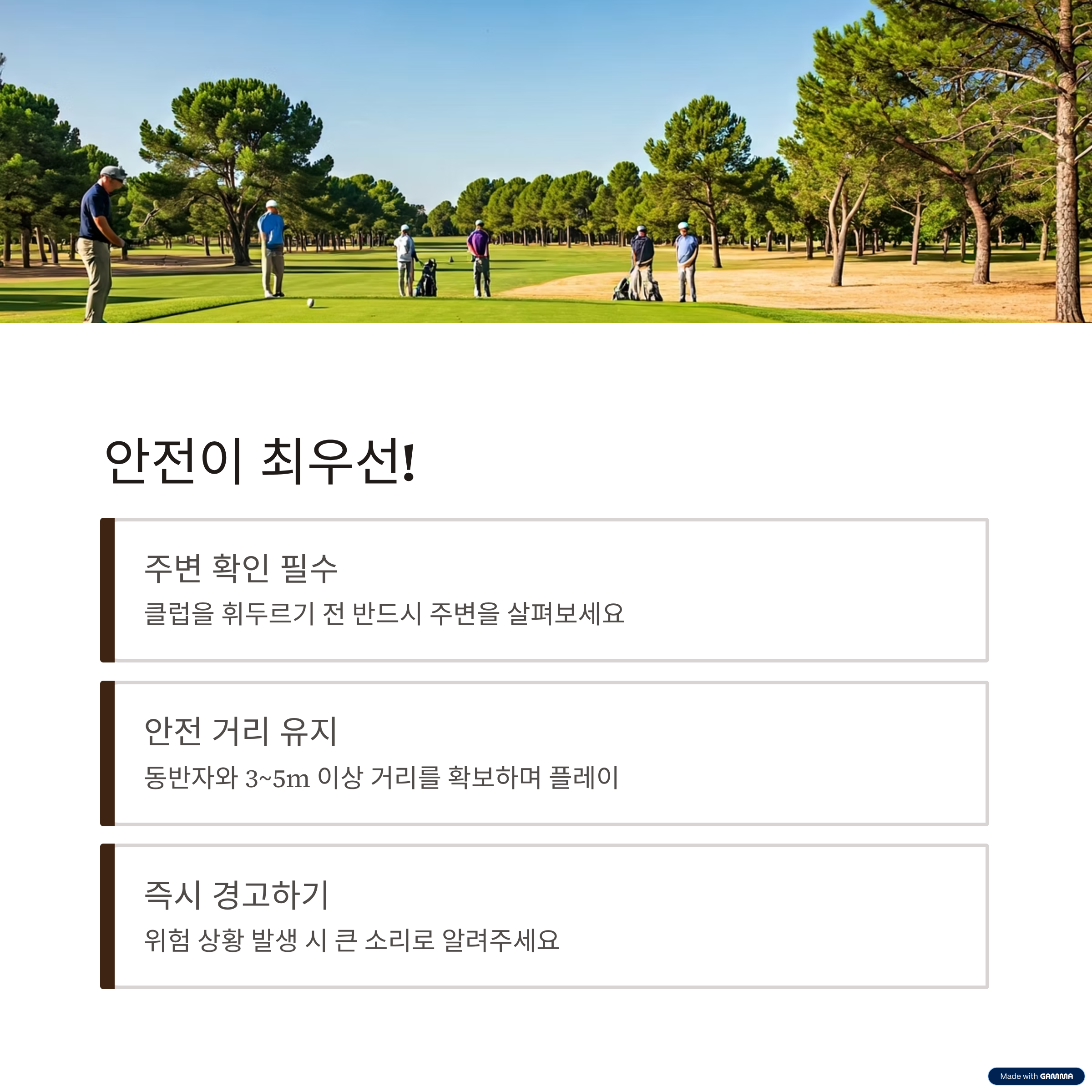 - 플레이 전 주변 확인, 앞 조가 이동 후 샷