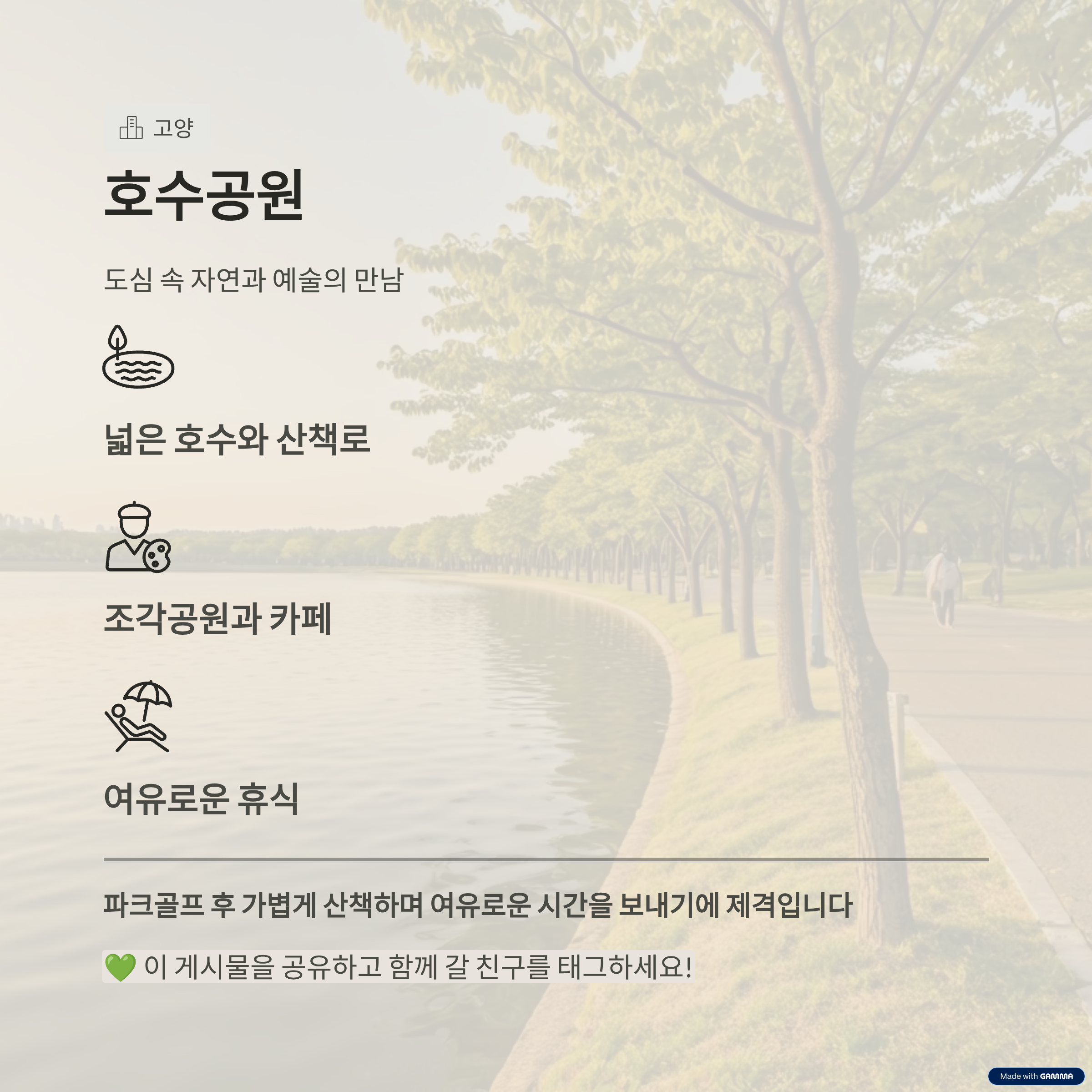 | 핵심 키워드 | 파크골프장 주변, 산책로, 관광지, 자연명소, 라운딩 후 코스 |