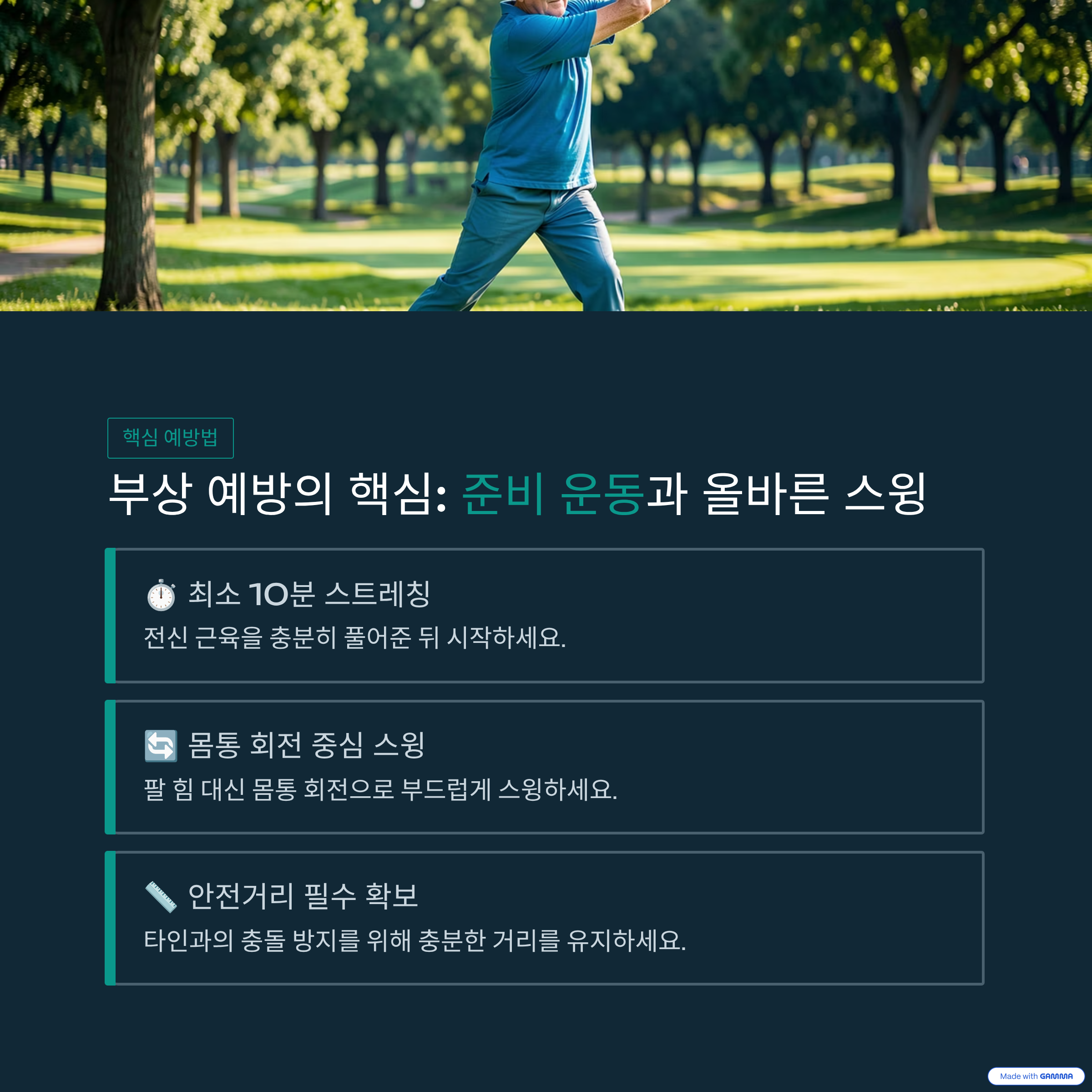 | 10분 이상 걷기와 허리 회전 스트레칭 필수 | 팔이 아닌 몸통 중심 회전 스윙 유지 | 운동 후 스트레칭과 수분 보충 중요 |