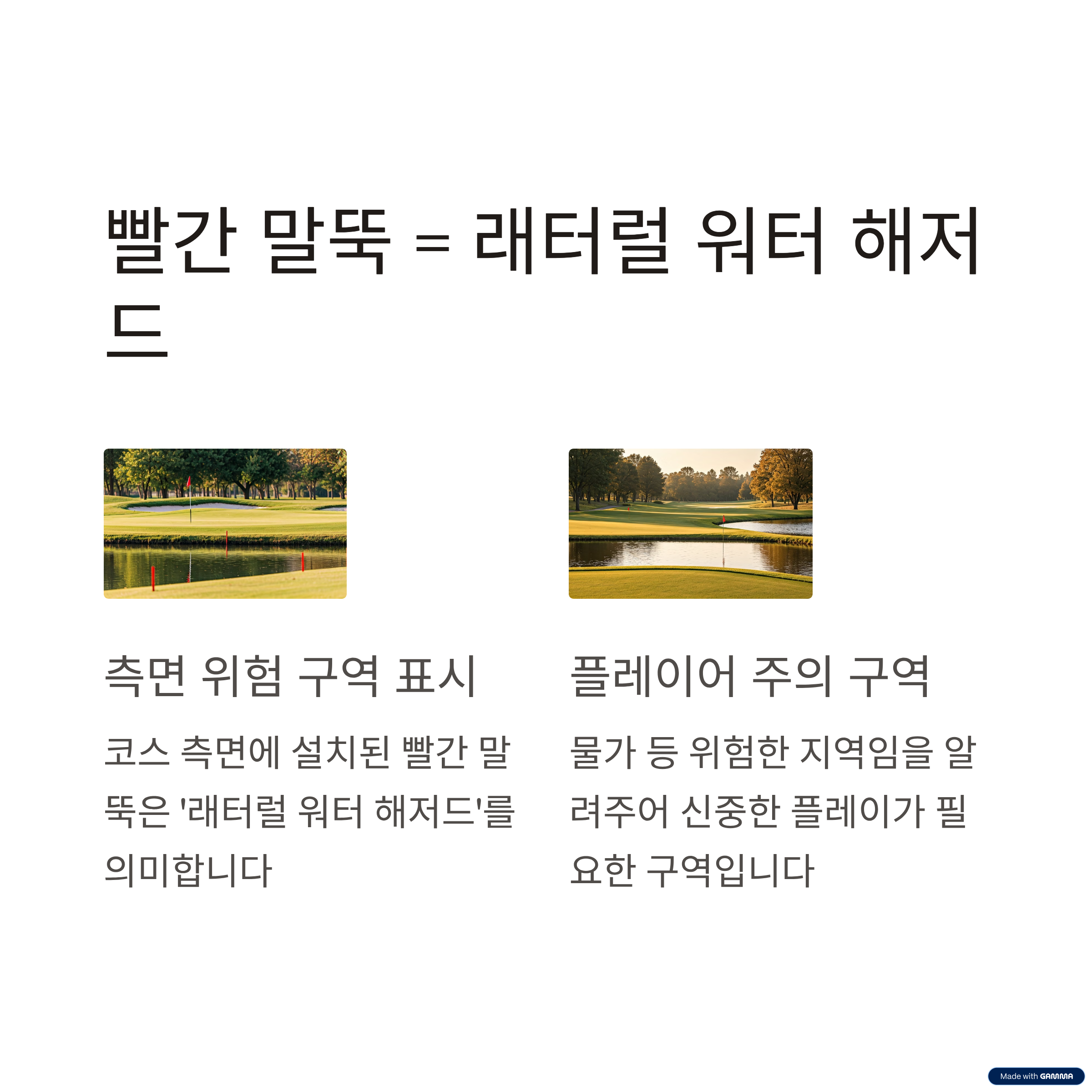 빨간 말뚝은 ‘래터럴 워터 해저드(Lateral Water Hazard)’를 의미합니다. 즉, 측면에 위치한 워터 해저드 구역이라는 뜻입니다. 일반적으로 연못, 하천, 수로 등 물이 존재하는 위험 구역이며, 이 구역에 공이 들어가면 플레이어는 페널티를 받고 정해진 규칙에 따라 다시 플레이를 해야 합니다.