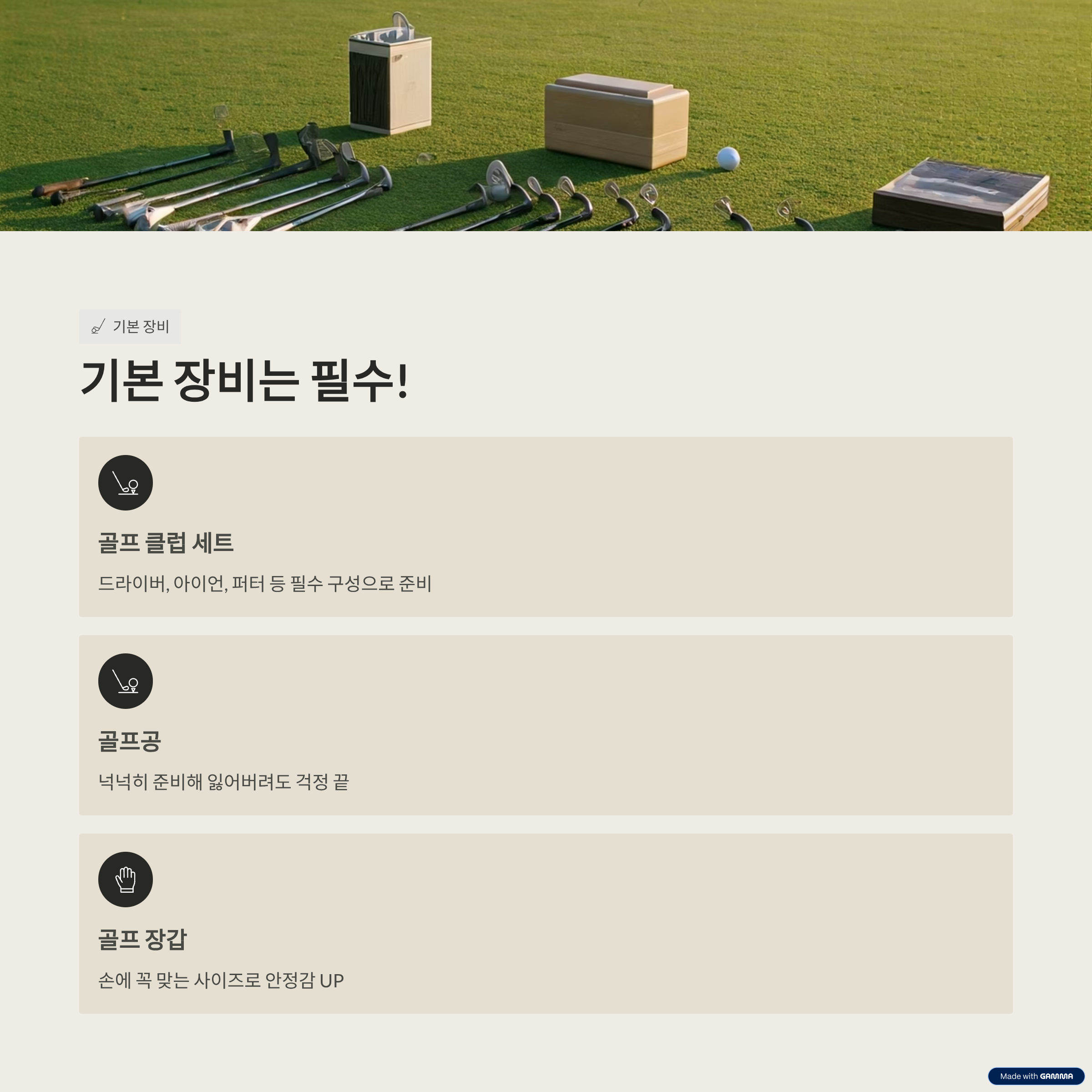 | 장비 | 클럽, 공, 티, 장갑 | 개인용품 추천 |