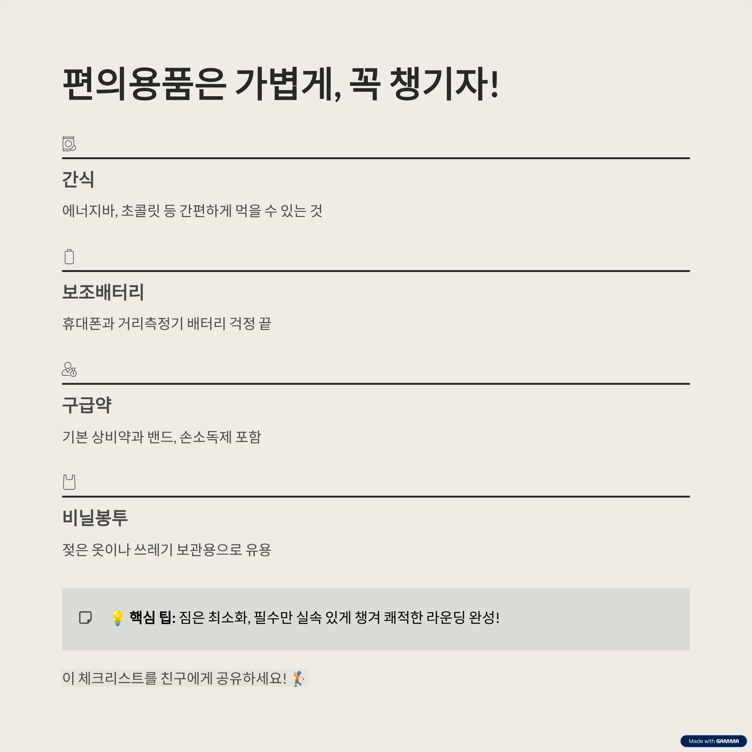| 기타 | 썬크림, 간식, 약, 보조배터리 | 야외 활동 필수 |