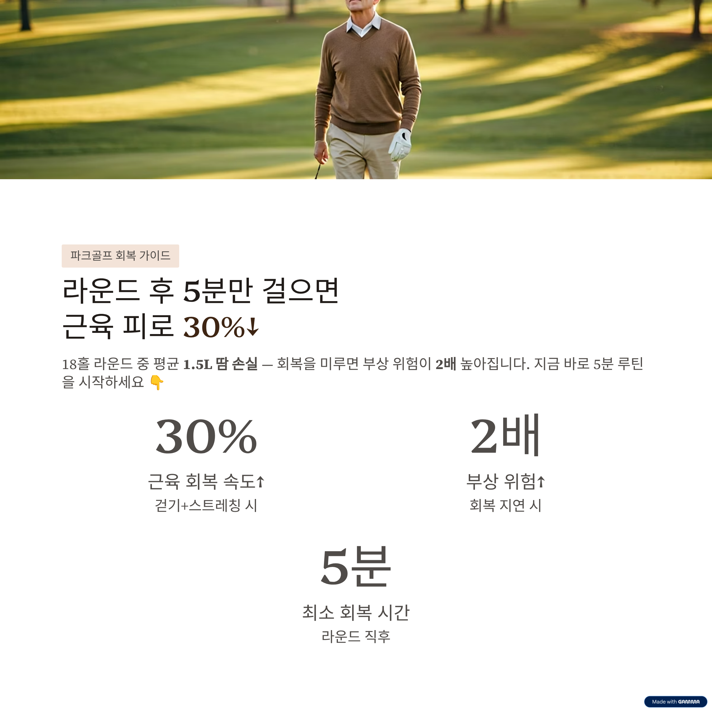 파크골프는 1시간 이상 걷기와 스윙이 반복되는 운동입니다. 격렬한 스포츠는 아니지만, 하체와 허리, 어깨 근육에 지속적인 자극이 누적됩니다. 운동 후 회복 관리를 제대로 하지 않으면 피로가 쌓여 통증으로 이어질 수 있습니다. 다음 라운드를 건강하게 즐기기 위해 반드시 실천해야 할 회복 관리 방법을 정리해보겠습니다.