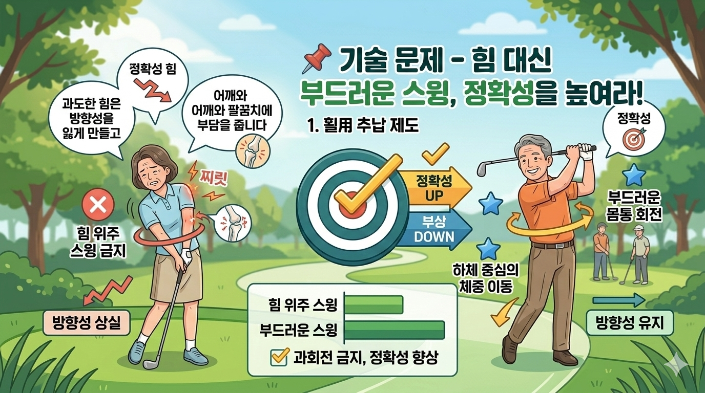 1. 힘으로만 치는 스윙 초보자는 공을 멀리 보내는 데 집중하다 보니 팔 힘에 의존하는 경우가 많습니다. 하지만 과도한 힘은 방향성을 잃게 만들고 어깨와 팔꿈치에 부담을 줍니다. 하체 중심의 체중 이동과 부드러운 몸통 회전이 기본입니다.