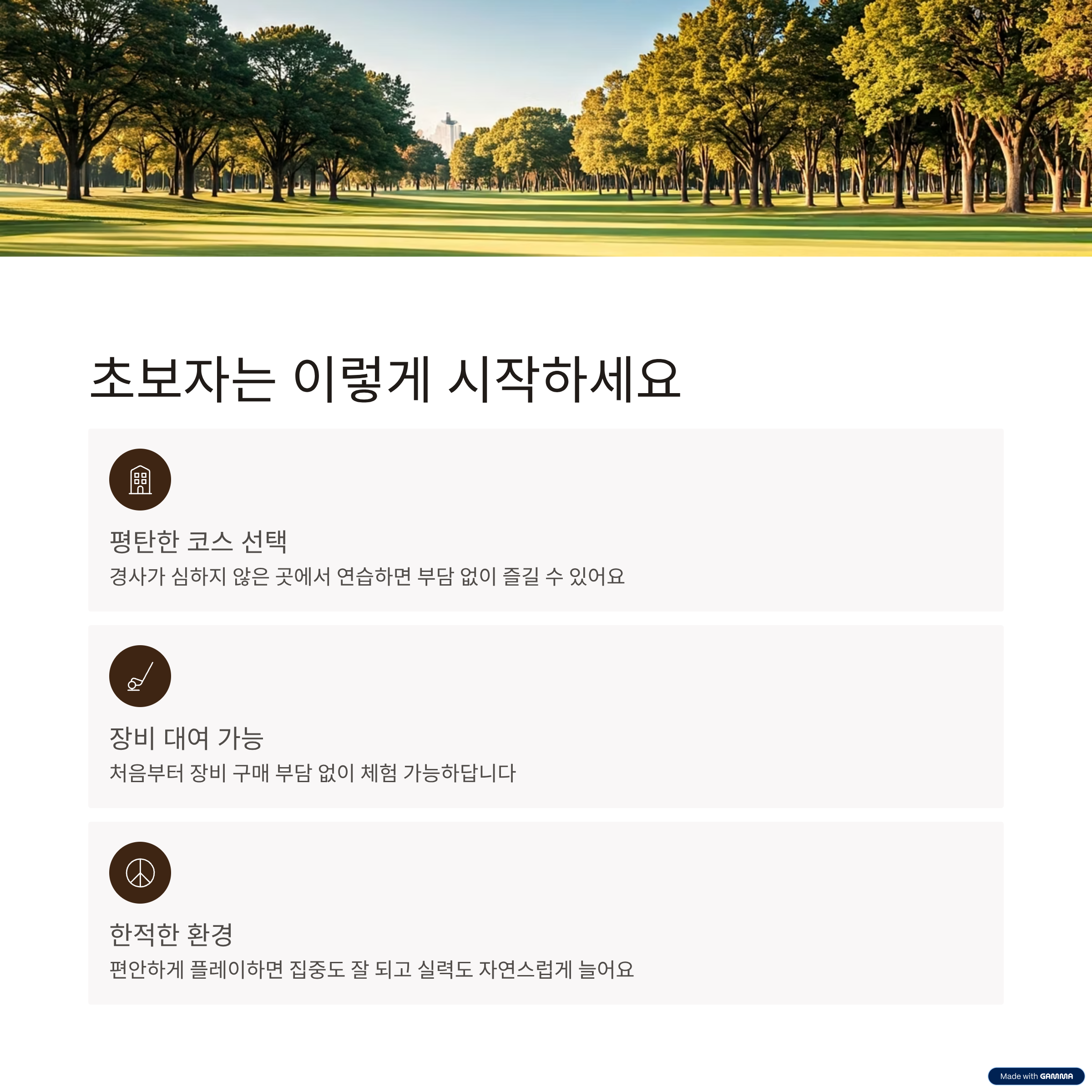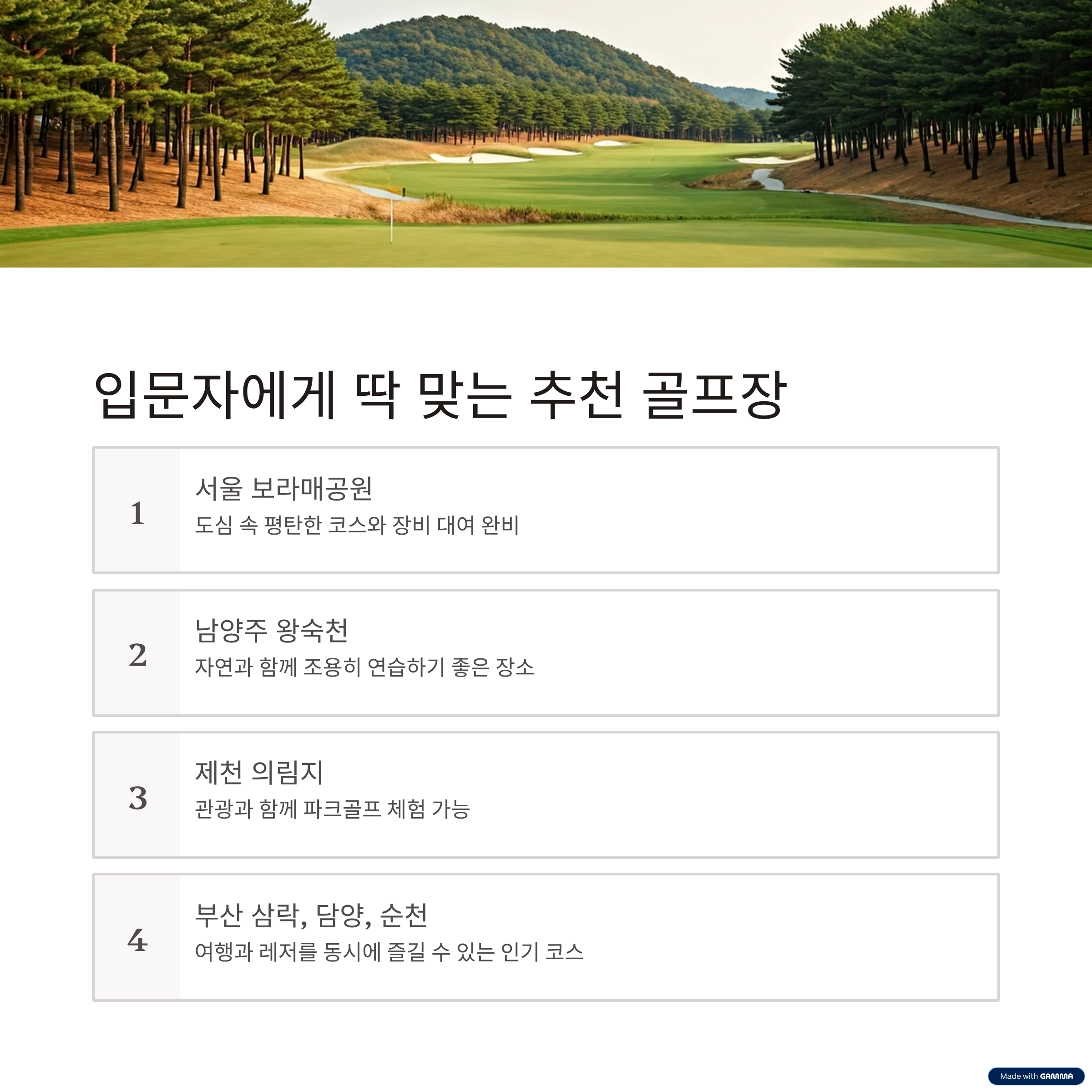 | 핵심 키워드 | 초보자 골프장, 입문 추천 장소, 쉬운 파크골프 코스, 친절한 코스, 연습용 골프장 |