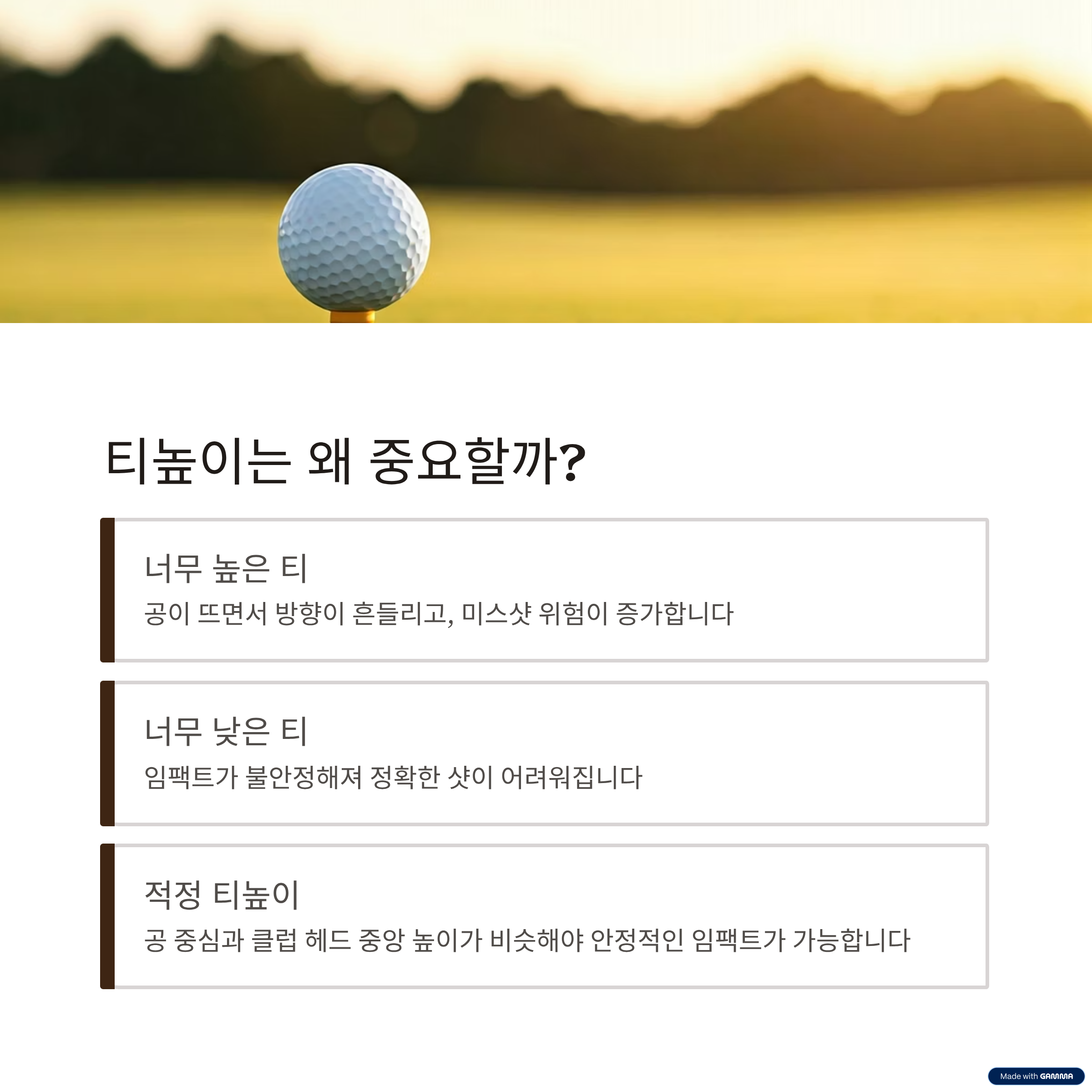 | 티를 너무 높게 꽂음 | 공이 뜨고 방향이 흔들림 |