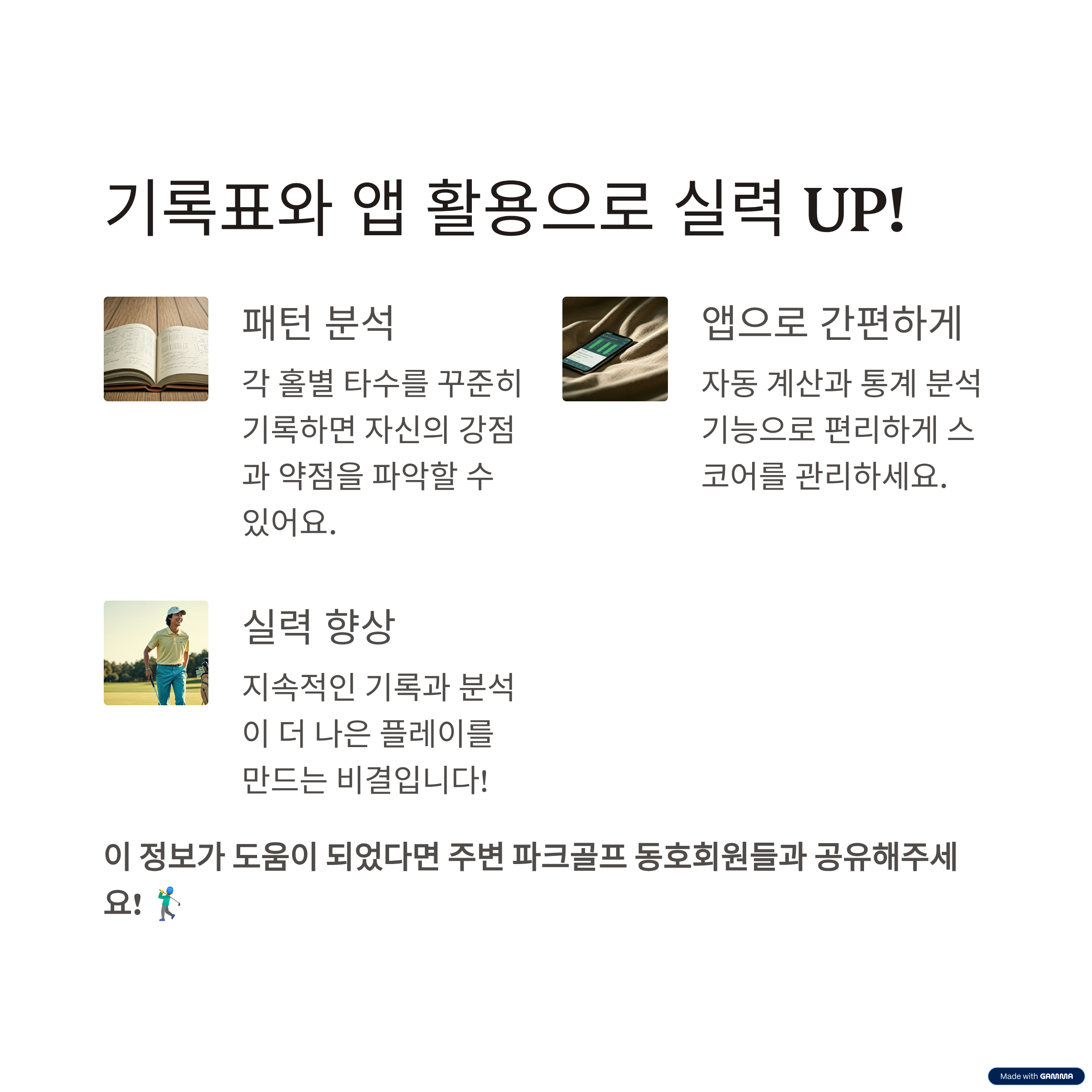 파크골프의 묘미는 단순한 숫자 경쟁이 아닌, 자연 속에서 자신의 리듬과 감각을 찾아가는 과정에 있습니다. 타수 계산을 통해 자신의 실력을 정확히 이해하고, 더욱 즐겁고 효율적인 플레이를 즐겨보세요.