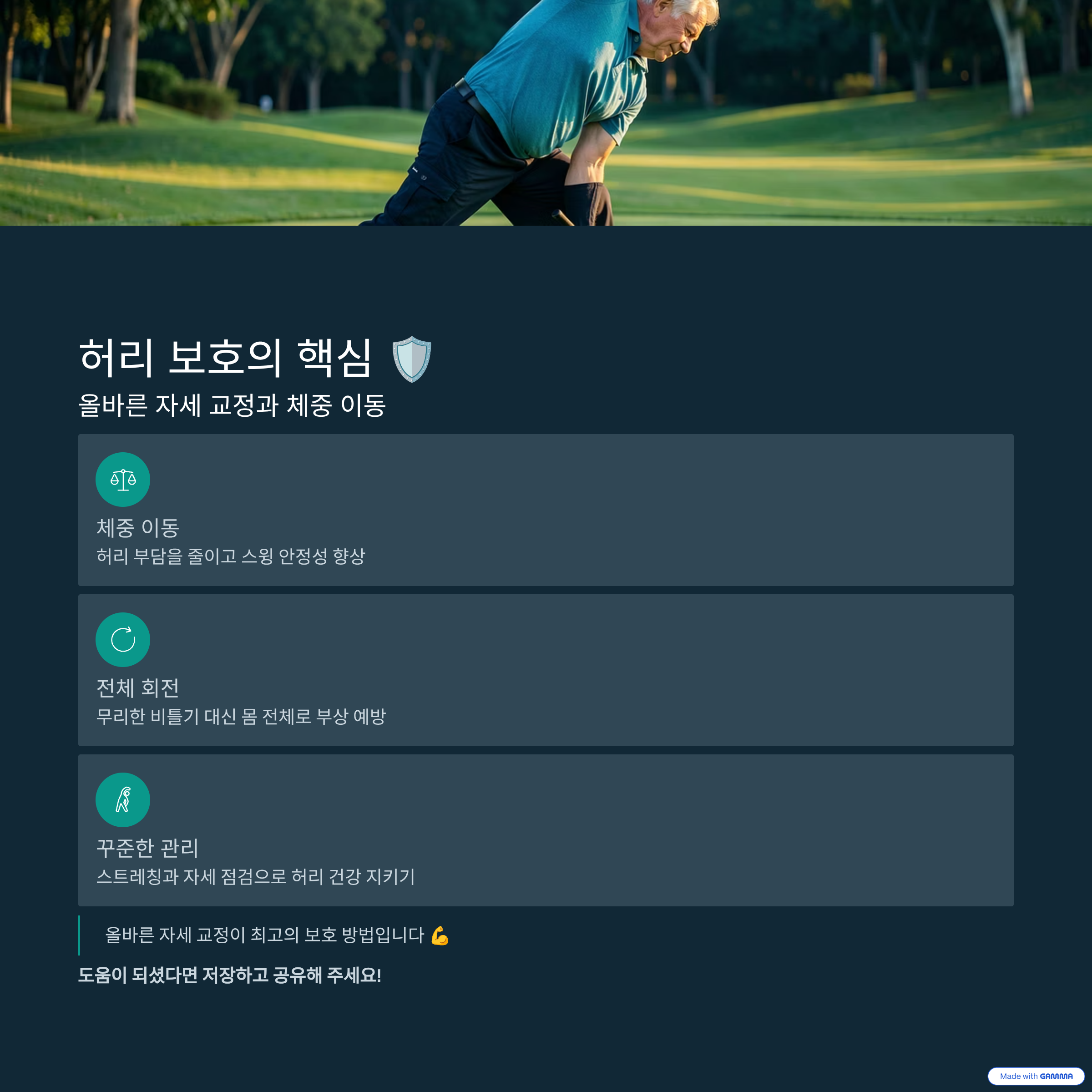 허리 통증을 줄이기 위해서는 힘보다 구조를 바꾸는 것이 중요합니다. 하체를 안정시키고 몸통 중심 회전을 유지하며 척추 중립 자세를 지키는 것만으로도 통증 발생 빈도를 크게 낮출 수 있습니다. 올바른 자세가 곧 최고의 보호 장비입니다.