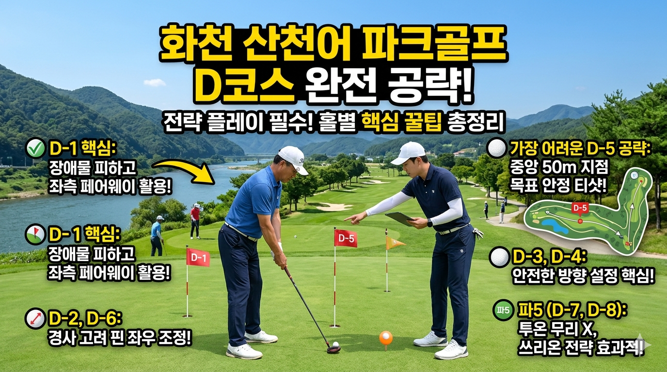 파크골프장을 다니다 보면 같은 구장 안에서도 코스마다 성격이 꽤 다르다는 걸 느끼게 됩니다. 화천 산천어 파크골프장도 마찬가지였습니다. 특히 D코스는 단순히 거리를 잘 맞추는 것만으로는 풀기 어려운 홀들이 많았고, 방향과 위치 선정이 훨씬 더 중요하게 느껴졌습니다. 저도 처음에는 핀을 직접 보고 공격적으로 치는 편이었는데, D코스를 돌다 보니 그 방식이 오히려 실수를 키우는 경우가 많았습니다. 좁은 페어웨이, 도그렉 구조, 경사와 오비 구간이 함께 있는 홀에서는 한 번의 욕심이 스코어를 크게 흔들 수 있었기 때문입니다. 그래서 이번 글에서는 화천 산천어 파크골프장 D코스를 기준으로, 왜 이 코스에서는 무리한 공격보다 전략적인 공략이 중요한지 정리해보겠습니다.
