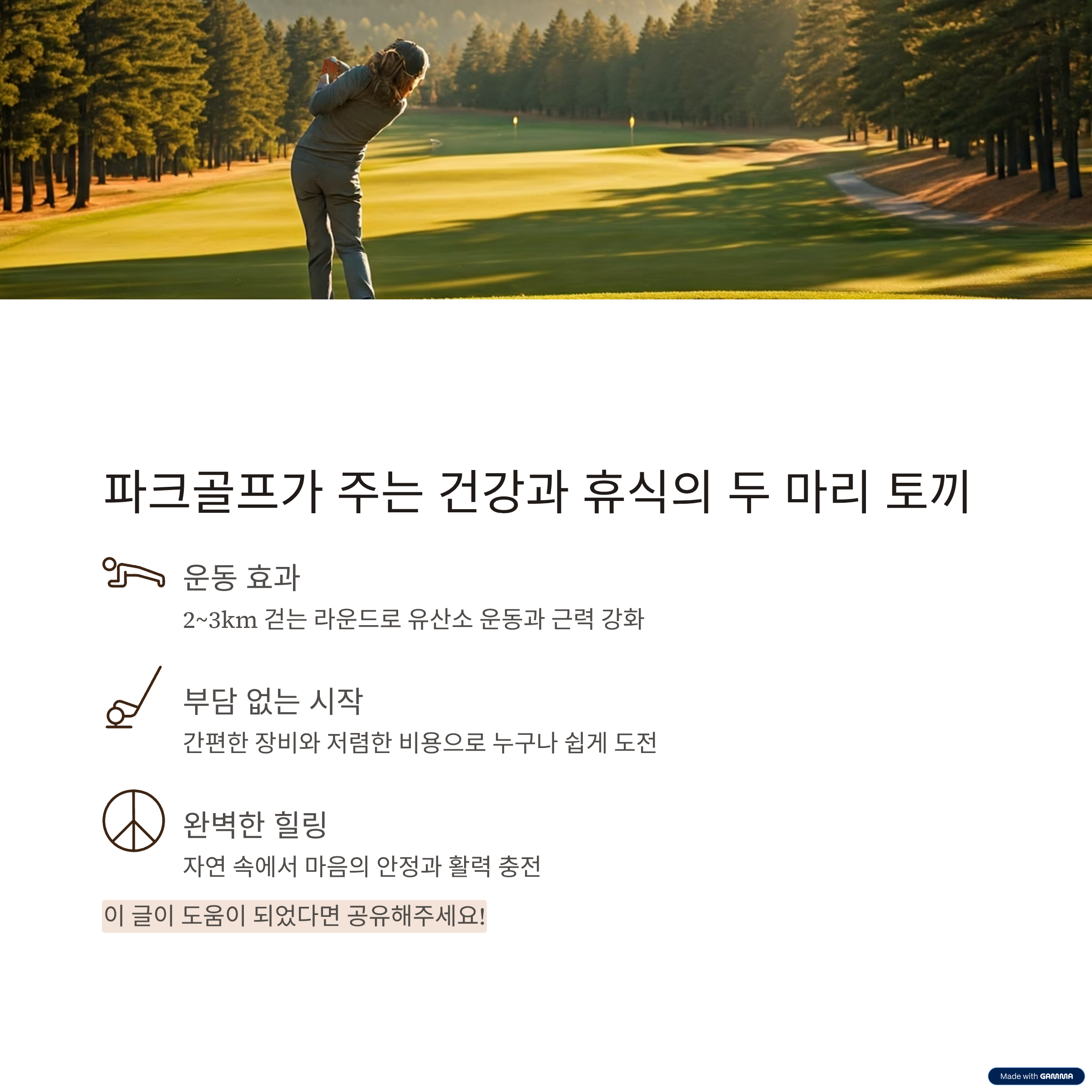 파크골프는 혼자서도 충분히 즐길 수 있는 스포츠입니다. 특히 자연을 배경으로 한 조용한 골프장은 단독 여행자에게 최고의 힐링 공간이 됩니다. 혼자만의 여행을 계획 중이라면 이번 글에서 소개한 코스를 따라 자신만의 시간을 누려보세요.